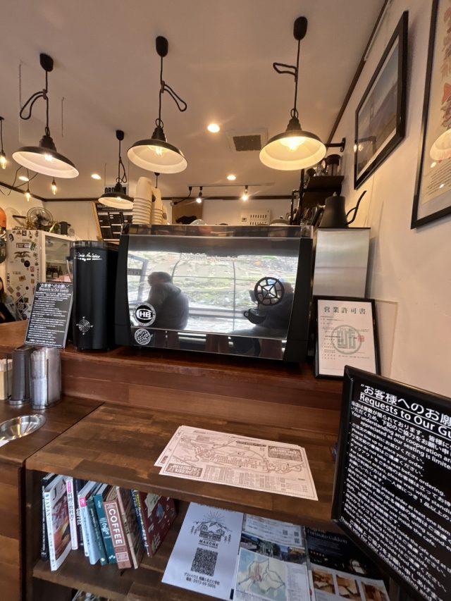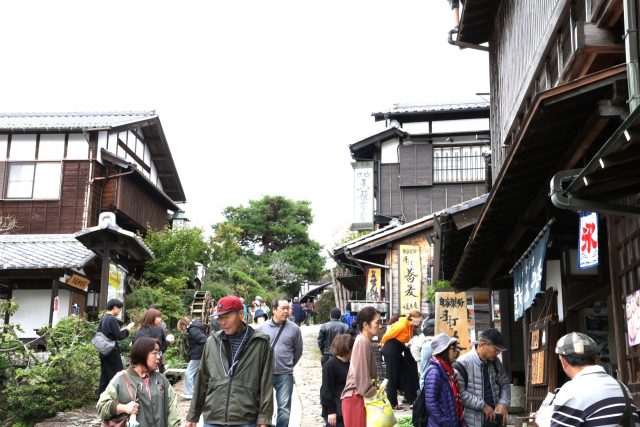 馬籠宿では坂道の両側に軒を連ねるカフェやおみやげ屋さんを楽しみながら歩くことができます。