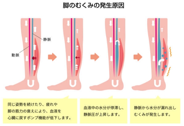 特に足のむくみは、ふくらはぎの筋肉のポンプ作用が不十分になることで発生し、これにより本来肺や心臓へ戻るはずの血液が下肢に滞留し、むくみを引き起こします。